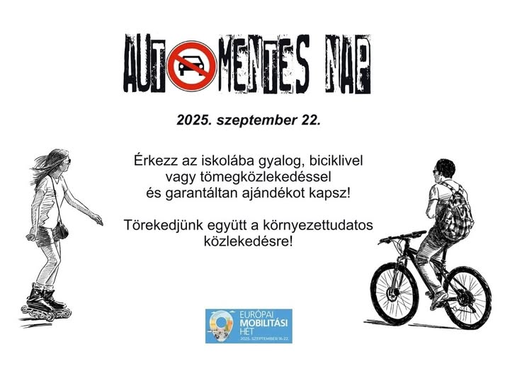 Szeptember 22-én iskolánk is csatlakozott az Európai Autómentes Naphoz.  Tanulóink közül sokan kerékpárral, rollerrel, gyalogosan érkeztek hétfőn iskolába. A kezdeményezés célja, hogy felhívja a figyelmet a környezet védelmére, a fenntartható és egészséges közlekedési szokások fontosságára.